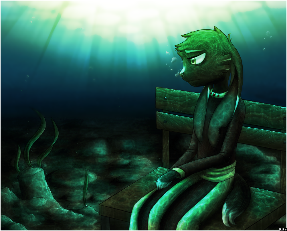 "For the record, the water is symbolism (I use that word a lot in these descriptions). Or a metaphor. Or something like that, I'm not the best at identifying elements. But anyway, she is not actually underwater, nor is the bench, it's mainly the rule of drama combined with intent to relate to her sad, sad life.